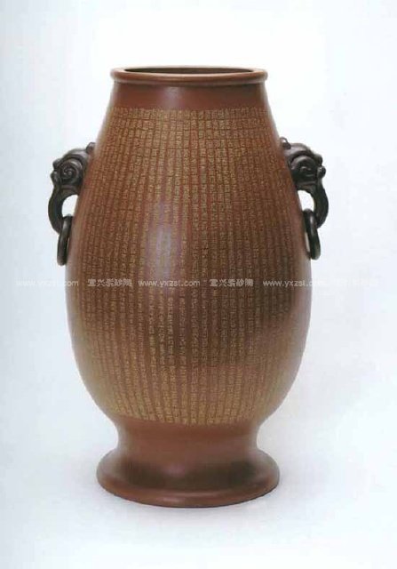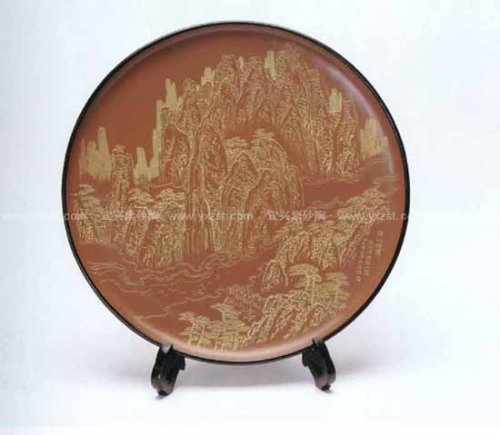 一、 个人风格的形成要在继承、借鉴前人传统的基础上不断探索,不断创新,不断升华,真正形成自己的特点。紫砂陶刻是以紫砂泥材质为载体的,因此要在充分发挥紫砂泥特性的基础上,汲取古代中国画中的十八描技法,融汇贯通,根据不同的题材,或抑扬顿挫,或逆锋疾驰,或轻刮浅刻,或提刀雕琢,或阴刻或阳雕。“唐宫佳丽美人瓶”、“太湖颂阳雕书法挂盘”等等可以说是此中比较成功的尝试。