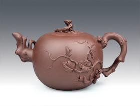 大自然中的万物,是取之不尽的创作源泉,紫砂花货也不例外。将自然界中的物体形态去粗取精,经过艺术加工提炼,方成为艺术品。而松鼠葡萄作品也不例外,葡萄果实堆叠繁密,象征着五谷大获丰收和富贵。成串的葡萄还有“多”的含义,鼠在十二时辰中为子,喻“子”之意,葡萄松鼠合喻为“多子”“丰收”“富贵”。 松鼠葡萄作品古雅大方,且极具自然趣味,枝叶及葡萄缭绕壶的全身,数只松鼠跳跃其间,憨态可掬,惟妙惟肖。壶盖略凸,以葡萄枝为纽,弯曲有致,整个壶勾画出一幅立体的艺术画面,真正做到了实用与艺术的完美结合。