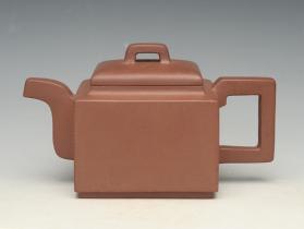 “亚明四方壶”整体造型比例协调;线面挺括有力;轮廓分明,全器气势挺拔;英姿飒爽,成就紫砂方器之美!1960年前后,由著名画家亚明(1924~2002;原江苏省画院副院长)设计,以方器、筋纹器风格见长的王寅春(1897~1977;建国初期的紫砂七大艺人之一)制作,合力完成! 桥钮、方形壶把、方形壶身,整款壶棱面挺括,线条刚硬,犹如将军风范。壶钮为标准的拱桥,钮孔为半月状,做工一丝不苟,极为精细。壶盖略微鼓起,由壶盖至壶身,四条棱线清晰分明,干脆利索,寓意善恶分明,将方器特色表达得淋漓尽致。