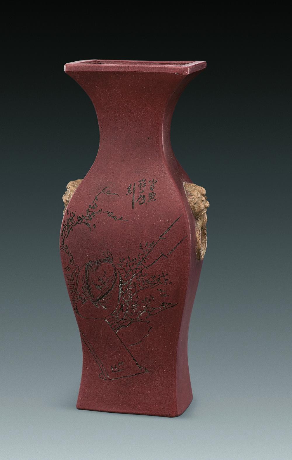 相关描述: 双耳瓶,器口外撇,溜肩,双兽耳,口衔不游环。器足处略微外撇,足底下凹成器足,造型秀美,富于变化。瓶之两面分别有人物纹饰和题诗,诗书合璧,相得益 彰。“诗如作画宜求淡,山似论文不喜平。宜兴永陶主人并刻”为诗文内容,意境高远。一面刻文人小憩图,依案凝思,姿态传神。高士图余白处有落款“宜兴■庭 刻”,字体流畅,与另一面刻诗文者为同一人。永陶主人乃清末民初紫砂雕刻工艺家,作品刻画传神。