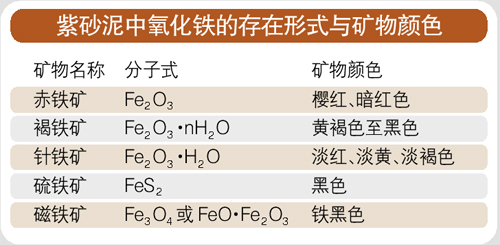 紫砂泥的主要化学组成为二氧化硅、氧化铝、氧化铁、氧化钛、氧化钙、氧化镁、氧化钾、氧化钠等,而化学组成又在一定程度上反映了泥料的工艺性 能,包括可塑性、收缩性能、烧成温度、烧成后的颜色等,如Fe2O3的含量不同,则成色不一:在正常烧成条件下,Fe2O3含量≤0.8%,烧成后呈白 色;含量为1.3%,烧成后呈灰色;含量为2.7%,烧成后呈淡黄色;含量为5.5%,烧成后呈淡红色;含量为8.5%,烧成后呈红色;含量为 10.5%,烧成后呈深红色。