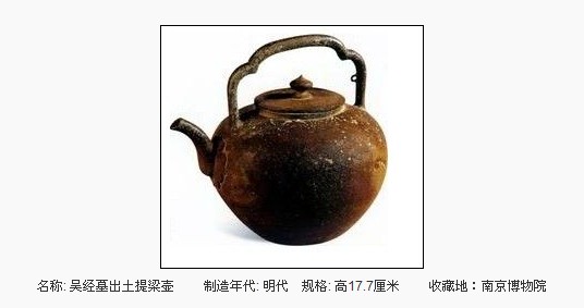 1965年,在南京中华门外马家山油坊桥明代嘉靖十二年(1533年)司礼太监吴经墓中,曾经出土了一把紫砂提梁壶,根据墓志考证发现,这是目前唯一有绝对年代可考的明嘉靖早期紫砂壶。