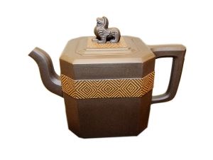 孔家兄妹虽说血缘相通、工艺大体相同,运用绞泥工艺装饰的紫砂壶却各有千秋。《金蟾送宝壶》是孔春华先生用上等清水泥制作而成,高挑秀美的壶身,菱花线贯穿壶体,八瓣菱花均匀有致,壶嘴壶把左右呼应,虚实得体,用绞泥和镶嵌手法把青铜钱装饰在壶体之上,吉祥大气,色调柔和。壶钮为微型的雕塑金蟾,使紫砂壶在雅俗共赏中,提升了艺术品位。