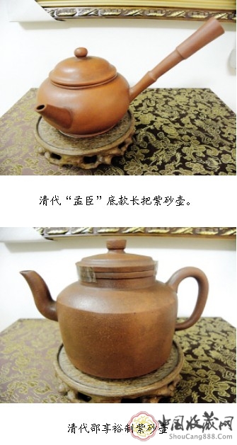 在成型工艺上,老壶与新壶也有明显差别。陈向打开一把近年制造的紫砂壶,示意壶友观察里面的痕迹。他介绍说,明代初期的紫砂壶都是以手捏制为主,壶 内甚至还留有捏按的痕迹。直到明晚期的制壶大师创制了木模制壶的方法,到了清代的壶匠人又开始使用打泥片的方法,这才有所改变。而近年来制造的新壶,由于 采用了压模生产的方法,其外型、内里都有了些生产线的味道。