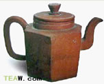 | 通高11.0厘米,口径5.7厘米,底径8.5厘米。一色赭红,坯体含有小砂粒,所以,虽经打磨,仍少平整,欠明润。壶身由六片大小相同的长方形平面组成一个菱柱形体,形态自然,无衔接之感。壶嘴、壶把和壶口处于同一高度。壶盖圆形,中有圆锥形纽。这可能与时大彬的“天圆地方”的观念有关。整把壶素面无饰。只是壶底刻有“大彬”两字,无署款盖章 。 |
