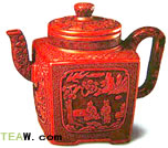 | 壶身呈四方形,其足由壶身的四个面延伸而成,每边呈拱桥状,看上去毫无故作姿态之意。此壶全身外髹红雕漆,做工十分细腻, 。 壶身靠视线一面雕刻而成的“ 高士品茗图 ”十分传神,使品茗者更能体察到饮茶的乐趣。在这幅图中,天空的云彩,对面的群山,近旁的大树和流水,展现了一派具有超脱凡尘野趣的品茗环境。而高士半倚方桌,茶童近旁奉茶,更加平添了“茶不醉人人自醉”的气氛。 |