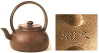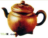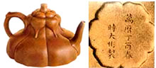 通高11.3厘米, 口径8.4厘米。壶身呈球形,素面无饰。只是在壶盖面上,环绕壶纽饰有四瓣柿蒂纹。壶的底部有三只小足,与壶身有机结合,浑然一体,无粘接之感。壶嘴外撇,与柄对称。在壶柄下方的腹面上,横排阴刻“大彬”楷书。壶的通体呈褐色,面上有浅色针装颗粒,虽不细腻,却有“银砂闪点”之誉,后人称之为“砂粗质古肌理匀”。 1994年, 邮电部发行的《宜兴紫砂陶》邮票中, 其中有一枚的画面就是时大彬的三足圆壶。它饮誉国内外,是明末紫砂器中不可多得的瑰宝,每每为收藏家所称誉。 |