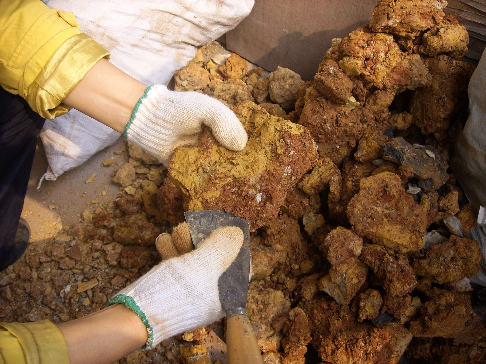 宜兴陶土品类繁多,一般分为白泥、甲泥和嫩泥三大类。白泥是一种灰白色的单纯粉砂质铝土质粘土,被广泛用来制作砂锅、日用器皿及美术陶瓷。甲泥是一种以紫色为主的杂色粉砂质粘土;嫩泥是一种土黄色、灰白色为主的杂色粘土,甲泥和嫩泥是制作日用陶缸、坛、盆、罐的原料。紫砂泥是紫泥、本山绿泥及红泥的统称,紫砂泥储藏於夹泥之中,本山绿泥则是紫砂层里的夹脂,红泥是由嫩泥矿里精选出来的,优质红泥原矿状如蛋黄成椭圆形,故又称『石黄』。本山绿泥生矿呈鸭蛋青色,烧成後呈米黄色,因此不了解的人刚一接触本山绿泥就误称为『白泥』,看了成品是米黄色又称为『黄泥』。据史籍记载,团泥原生产於青龙山北的团山,是紫泥与本山绿泥自然杂生泥,烧成呈古铜色。後来矿源断後,人们就将砂与本山绿泥按一定比例配此而成。