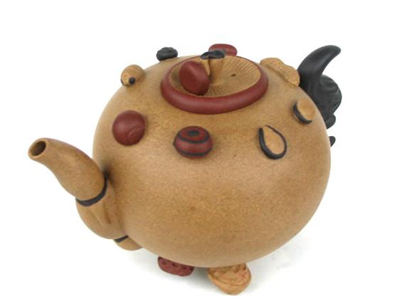 此壶材质为紫砂五色土,形态自然逼真。壶流用白泥堆塑莲藕,与深褐色菱角壶把相对称;壶腹、壶底饰满各式果品,蘑菇式盖顶上又饰一小蘑菇钮,抑扬顿挫,使全壶色调更加显现,秀色中见灵气,美的写真与壶的实用高度和谐,这是妙不可思的塑中神品。