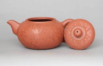 巧形,周君法作品的凸起特点是不完全对称,不用工整的图案,外形精巧,具象和抽象相结合,加以夸张的手法,所以他的作品流露着浓重的大天然气味:西瓜壶枝叶逼真,果实与藤蔓相映成趣;枇杷壶构思巧妙,将把手用树枝的形态表现出来,苍劲有力,外形精巧;春鹃壶以花朵为盖,蕊柄顺延成钮,透露出春日融融、杜鹃灼灼的盎然气愤但愿;秋菊壶由一朵盛开的菊花勾画出清楚的轮廓,使人领略无限的秋韵;夏莲壶整个壶体就是一朵荷花包裹的莲蓬,小巧精致的彩蝶歇在莲芯上形成壶钮,颗颗莲子流动自如,一派“荷深水风阔,雨过清香发”的诗意画面。