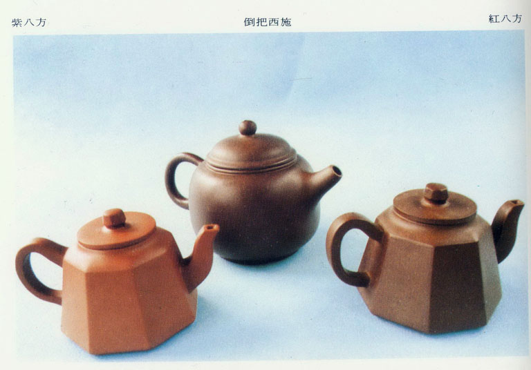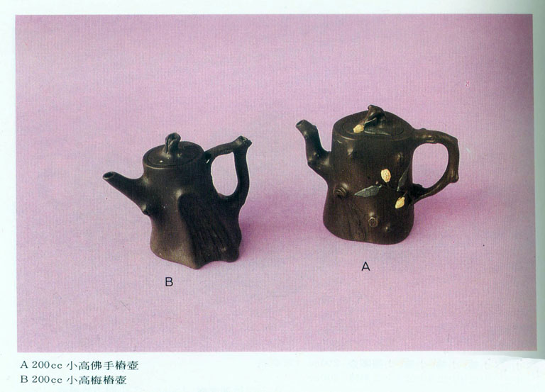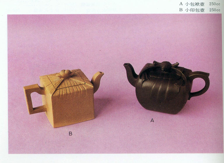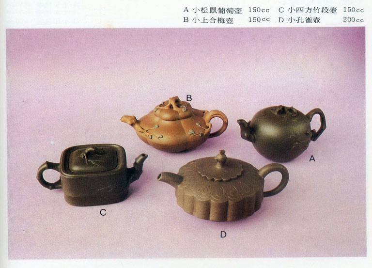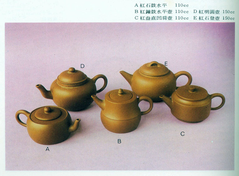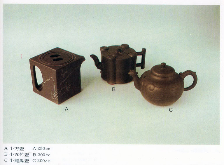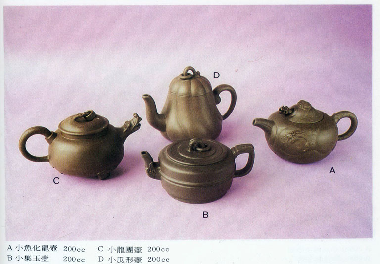 一般谈到紫砂厂的历史,大都还是习惯于1954年. (宜兴蜀山紫砂陶业生产合作社筹建开始) ------------------------------------ 在近代的商品壶,台湾有1965-1981以及1982-1985这样的两大系商品之分,陆陆续续将可抽空提供! 而,首先,提供香港锦锋公司在85年出版的“壶锦”一书,书后所附录的商品壶,给大家参考!