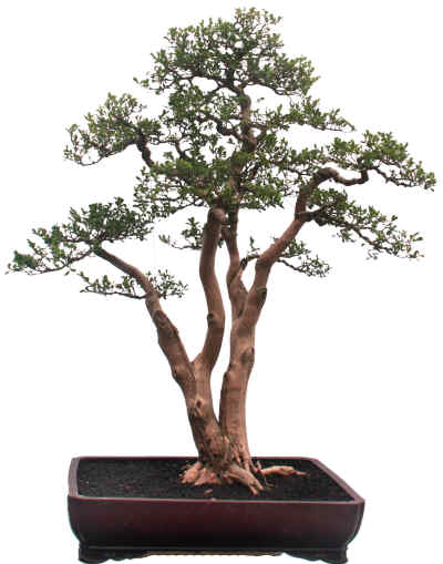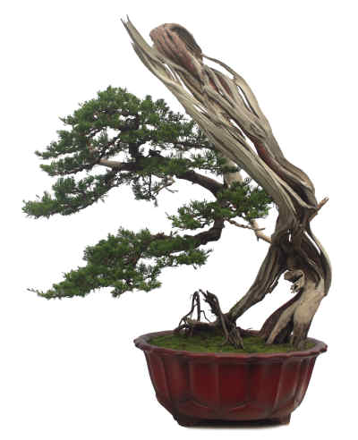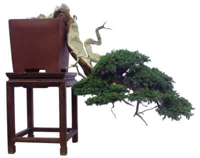 赏析:主干斜立,中间两枝干比例协调,均作斜势,姿形幽雅得体。桩体表皮斑马线自然贯通,神枝、舍利亦无人工痕迹,枝片成簇生,一眼看去是颇有峥嵘之势的老树,可渭“小中见大”、超然而立。