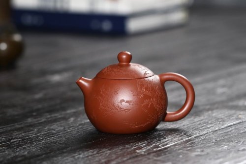 全手工优质紫红泥精致亚明四方壶 装饰枯枝鸟图 特文气