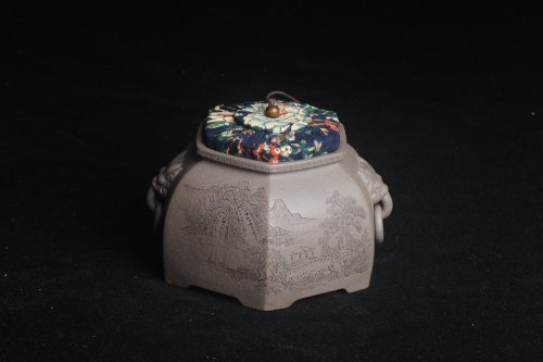 精品特惠 助工老青段精品山水六方瑞兽双耳罐 茶仓 茶叶罐 水洗