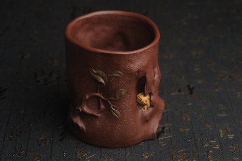 美筒特惠 精致全手工紫泥藏蟾笔筒 高12cm直径10cm 贴叶灵动 金蟾生动
