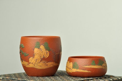 泥绘通景山水 老朱泥对杯 相映得趣