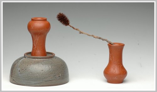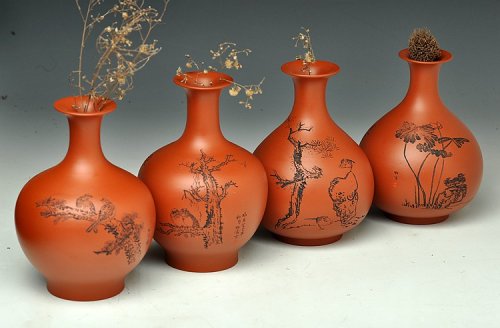 朱牧青老师原矿小红泥花瓶一套 做工精细 刻绘生动