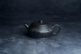 美壶特惠 精品柴烧青灰泥卡盖虚扁紫砂壶刻竹特文气 编号34456 美壶定制