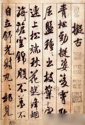 米芾《蜀素帖》,亦称《拟古诗帖》,墨迹绢本,行书。纵29.7厘米,横284.3厘米;书于宋哲宗元祐三年(1088),米芾三十八岁时,共书自作各体诗八首,计71行658字,署黻款。