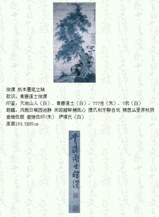 徐渭字文清,号天池隐士,又有田丹水、天池生、天池渔隐、青藤白叟、金垒、金回隐士、山阴平民、白鹇隐士、鹅鼻山侬等别名。晚年号青藤羽士,或署名田水月。 山阴(今浙江绍兴)人。所居在绍兴城内,有“一枝堂”、“柿叶堂”、“青藤书屋” 等。生于明武宗正德十六年(1521年),卒于明神宗万历二十一年(1593年)。