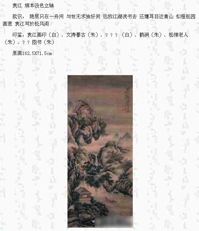 袁江是我国绘画史上有影响画家,转工山水楼阁界画。在清康熙、雍正、乾隆时期,楼阁工整山水当以袁江最有名。当时还有他的侄子袁耀同齐名。