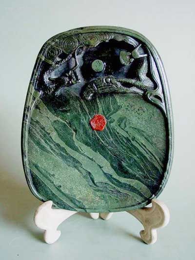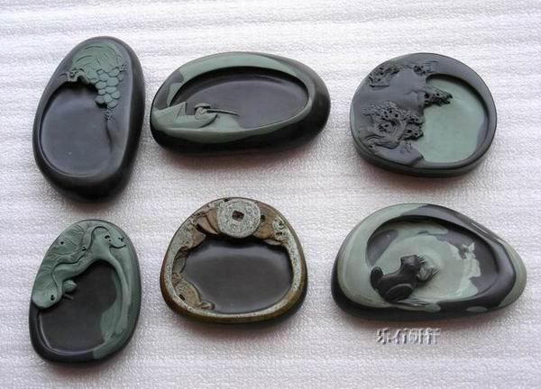 砚,在西汉时期即已使用,湖北荆州凤凰山西汉墓出土了砚,我国传统有四大砚,即端砚、歙砚、洮砚、澄泥砚。端砚产于广东端州(肇庆市)东郊端溪,唐代就极出名,李贺有诗日:“端州石工巧如神,踏天磨刀割紫云”,赞石工攀登高处凿取紫色岩石来制砚。端砚有“群砚之首“的称誉,石质细腻、坚实、幼嫩、滋润,扪之若婴儿之肤,。温润如玉,磨之无声,发墨光润。石上且有鸲鹆眼等自然纹理,歙砚产于徽州,徽州是府治,歙县是县治,同在一地。所以歙砚与徽墨乃是“文房四宝”中同产一地的姐妹。歙砚的特点,据《洞天清禄集》说:“细润如玉,发墨如饥油,并无声,久用不退锋。或有隐隐白纹成山水、星斗、云月异象。”端砚资源缺乏,名贵者已不多;歙县地处黄山之阳,取材广泛,近年仍有镂刻工极细之艺术大砚出产。洮河砚之石材产于甘肃临洮大河深水之底,取之极难。澄泥砚产于山西绛州,不是石砚,而是用绢袋沉到汾河里,一年后取出,袋里装满细泥沙,用来制砚。另有鲁砚,产于山东;盘谷砚,产于河南;罗纹砚,产于江西。一般说,凡石质细密,能保持湿润,磨墨无声,发墨光润的,都是较好的砚台。