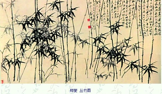 郑燮写竹亦讲求抑、扬、顿、挫,有开有合,作品《兰石图》笔法精炼,气象沉稳,有兰有竹,各得其趣;《竹石图》中近景之竹形态纤瘦,用墨厚重,远景之石用墨清淡,意境简约,删繁就简,虚实浅淡,充满层次感;所作《丛竹图》则另辟蹊径,竹竿顶立于咫尺画面,分数组排列,有的直立,有的倾斜,画面散中求动,充满奇趣,洒脱中寓自然,别有一番风貌。