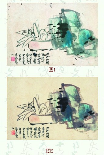 不过,确也有个别原来残损严重的名家作品被“修补”得令人拍案叫绝。就以入拍于南方某拍卖行2005年秋季拍卖会的图1吴昌硕作品来说。起初它的品相真有点惨不忍睹——画面除了有许多虫洞外,还有不少地方都掉笔少墨,因此它的起拍价仅订到0.7万元。仅时隔半年,当该画再度现身于南方另一家拍卖会上时,它已一改旧颜成了图2这副新模样。原先画面所有的残破处被“修补”得几近天衣无缝,于是起拍价也立马涨到5万元。