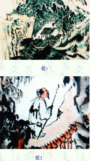 我数年前在浙江书画市场上看到过一件署名陆俨少的山水画,图1是该成品的局部(出于某种考虑特不刊载全图)。刚看此画时我并未发现什么问题,但当我目光再落到画上的点景人物处时,就不禁心中生疑。因为这个小小“山里人”的笔性与造型状态皆不具有专业级水准,像是一位“业余画家”的随意点画手迹。后来我无意中从一位原来曾经收藏过此画的收藏家那里了解到此画画面中原来并没有“人”的存在。因此我认定图1是一件署名陆俨少的被“添笔”疑伪作品就得到证实。也就是说该画多数内容是陆俨少亲笔,唯点景人物是赝迹。图2是陆俨少相近时期创作的有点景人物的山水画真迹局部,此画上的“策杖长者”着笔虽少,却有“曲尽其妙”之艺功,不会像图1上那样只是个平面的人形(另见图1局部),它较具比较的证据说服力。