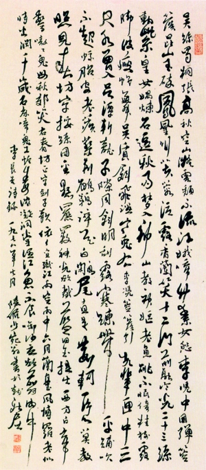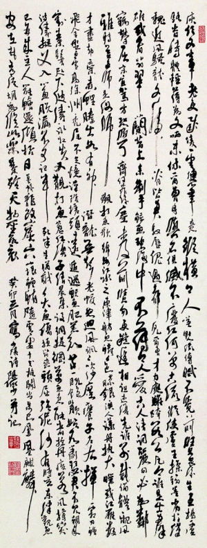 但不管怎么说,疑伪终归是疑伪,现在我只要提出以下两个问题,便可证明。一是我所接触到的陆俨少直条幅的书法作品,通常都是作画之余偶尔为之,一般都只写一首律诗或绝句的字数,我从未见过有写到洋洋洒洒数百字的,那为什么到作者逝世十多年后有这么多笔墨特征相像的书法“巨制”一下子都到各地拍卖行去“挤兑”?二是图一与图二两成品的字体面目基本一致,但署年的时间跨度却很大,图一署的是“癸卯”(1963年),图二署的却是1978年,若它们真的书写时间相隔了15年,那字体有可能“一成不变”吗?