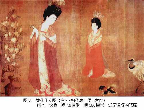 周昉不仅在肖像画上挖掘到人物的心灵深处,更悉心于将宫中各类仕女的心态微妙地展示在绢上,如忧郁、感伤、悲叹、惆怅和怨情等,概括地表现出经由“安史之乱”后,唐宫仕女们颓唐的精神状态。这也是走向下坡路的大唐帝国的一个缩影,折射出周昉的忧患意识和对被幽禁于深宫的宫妃们的同情,深化了张萱仕女画的主题。张萱与周昉分别糊口于“安史之乱”前后,时代的差异必定会在他们的仕女画中的女性精神面貌上有所反映。