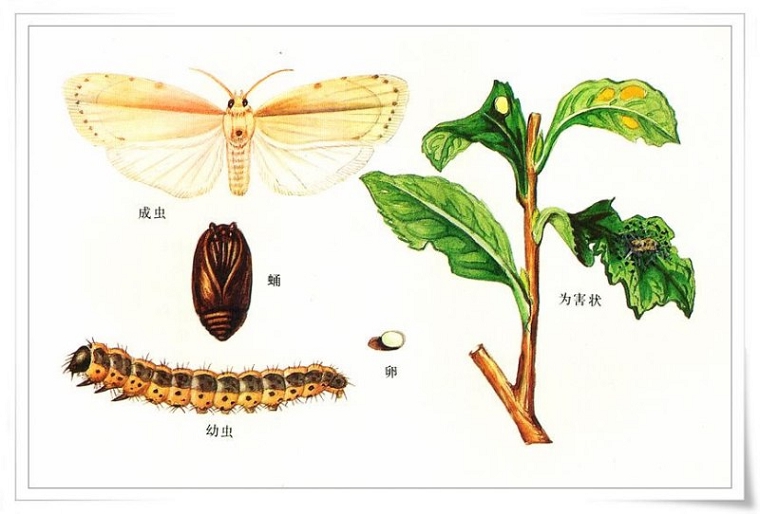 茶谷蛾[Teatineidid]茶树害虫。学名:AgriopharathombataMeyrich。鳞翅目,谷蛾科。分布于中国云南、福建、湖南、广东、广西、海南、台湾等地。寄主有茶和油茶。以幼虫咬食叶片为害。成虫体长9~13毫米,翅展24~35毫米,体、翅淡黄色,胸背有一黑色圆点,前翅基部至中部有一淡黑色纵纹,沿外缘有1列黑点。雌蛾触角丝状,雄蛾栉齿状。成长幼虫体长20~28毫米,体淡黄色,头黑色。体背左、右各有1条黑色宽带纵贯全身,各节侧面各有两个黑色毛疣,臀板黑色。年发生3-4代。成虫飞翔力弱,无趋光性,将卵散产于叶背。幼虫吐丝将两叶叠结成纺锤形虫苞,匿居苞内咬食叶片,老熟后在虫苞内化蛹。天敌有蜘蛛、寄蝇、茧蜂、大腿蜂等。防治方法:采除或剪除虫苞。用化学农药喷杀,药剂见“茶尺蠖(1)”。